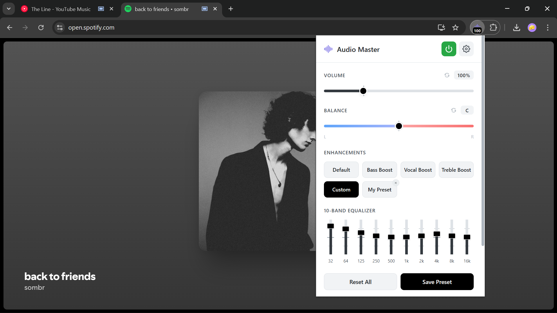 Everything you need to enhance your browser's audio experience, all in one free extension that respects your privacy.